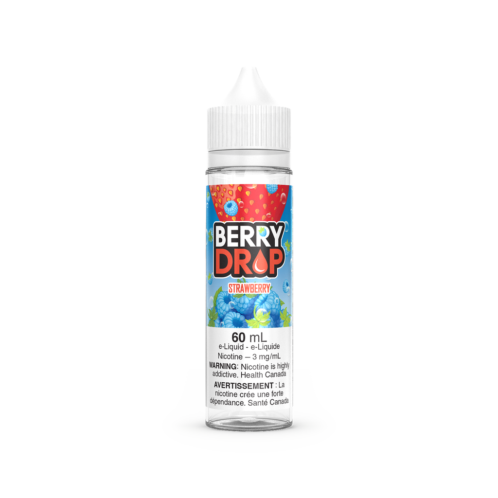 Présentation des e-liquides STRAWBERRY BY BERRY DROP, un mélange délicieux et classique de fraise et de framboise bleue.